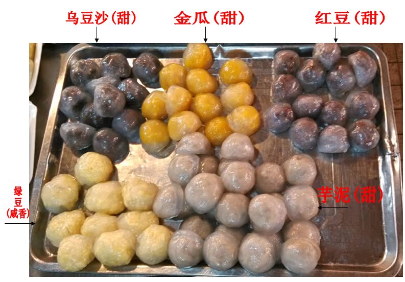配料:番薯淀粉、乌豆沙、红豆、南瓜。绿豆、芋泥
