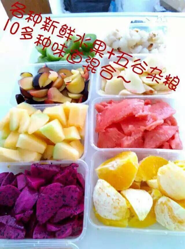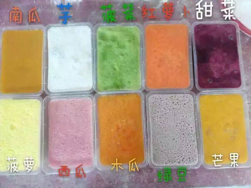 配料:草莓、火龙果,菠萝、芒果、南瓜、吊瓜(青脆瓜)、红萝卜、火焰红萝卜,菠菜、马蒂、紫红薯等