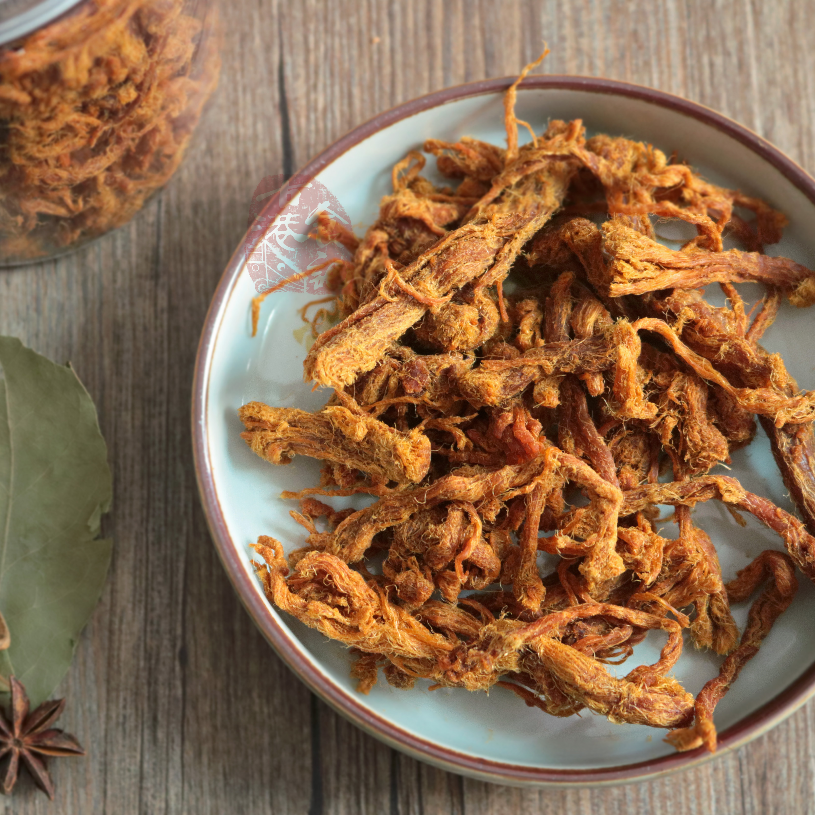 接下来,慢火慢炖三个小时,捞起沥干后,需费时费力地把肉块手撕成一丝丝的肉条,再加入酱油、白砂糖、五香粉,搅拌均匀、入味。