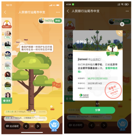 “3·12”植树节前后,人民银行汕尾中支积极响应义务植树号召,依托支付宝APP开展线上“云植树”活动,以“人民银行汕尾市中支”为名在“蚂蚁森林”发起合种先锋林,并面向全辖干部职工发送“动员令”,倡导每天通过绿色出行、减纸减塑、循环利用等方式积攒绿色能量、浇灌树苗。短短5天时间,人民银行汕尾中支辖区共有59名志愿者参与其中、累计浇灌15000多克绿色能量,在中卫地区成功申请种下了一棵樟子松,以实际行动践行绿色环保的生活理念,为我国大西北植树造林、为实现“碳中和”目标贡献了基层央行力量。